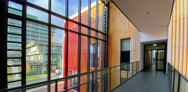 In ZEMOS, architecture and design come together to foster innovative and unconventional scientific thinking: In the colorful and transparent interior, national and international scientists find bright offices, shared spaces for scientific discussions, and place for large equipment.